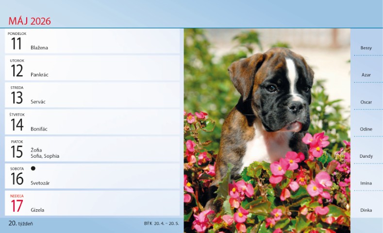 Praktický menší formát stolového riadkového kalendára pre všetkých milovníkov najlepších štvornohých priateľov, doplnené psími menami.