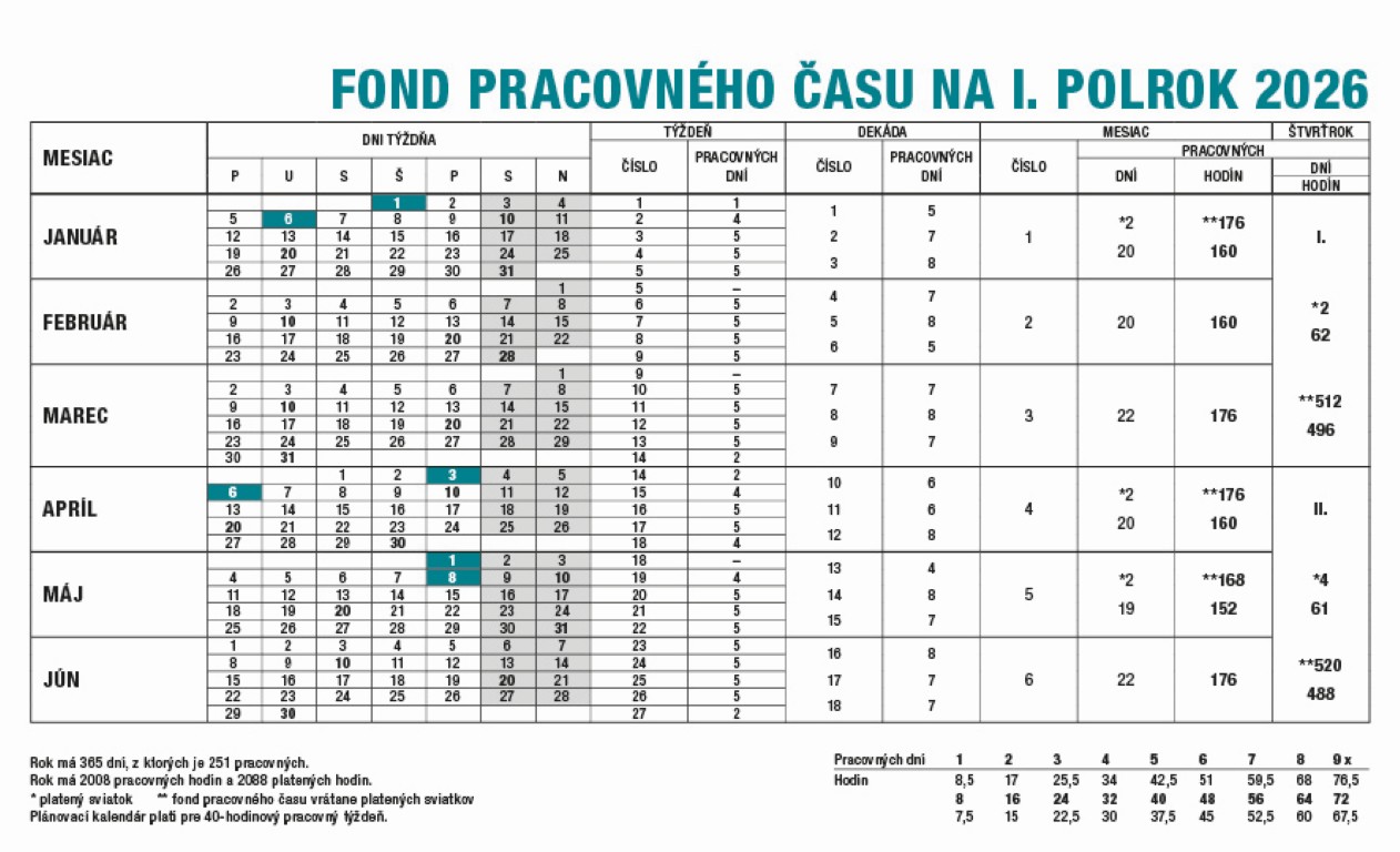 Pracovný týždenný kalendár s pranostikami. Riadkové kalendárium. Obsahuje dane, fond pracovného času, sviatky v EU, východy a západy slnka, fázy mesiaca.