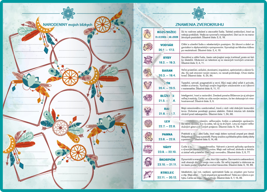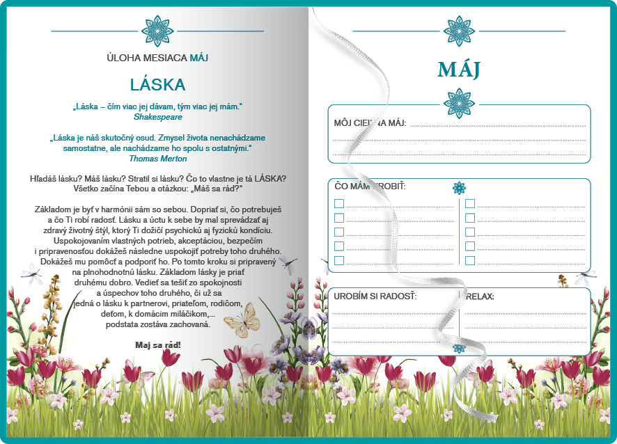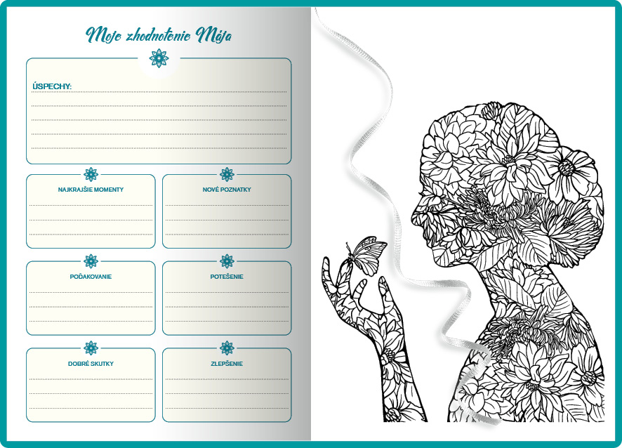 Obľúbený diár s graficky prepracovaným týždenným kalendáriom Vám spríjemní každý týždeň novým mottom. Každý mesiac nájdete súhrn svojich cieľov či myšlienok, ku ktorým Vás nabudia motivačné texty na začiatku každého mesiaca. Počas voľných chvíľ si môžete vymaľovať tematické antistresové omaľovánky. Diár má praktickú flexi väzbu so záložkami. Povrchová úprava – soft touch lamino, efektná razba a 3D lak. Všetky bočné plochy diára sú potlačené farebným motívom. Vhodný ako darček.