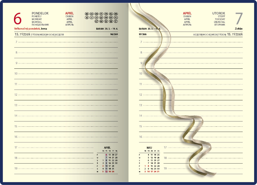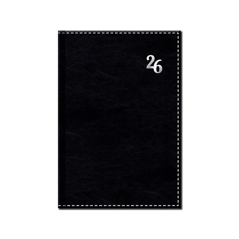 Luxusný denný diár z ekologickej kože s prehľadným kalendáriom na každý deň. Diár je v pevnej väzbe s prednou aj zadnou penovou doskou, doplnený ozdobným prešitím po obvode diára, strieborným plieškom s rokom a dvoma lacetkami. Obsahuje slovenské kalendárium.