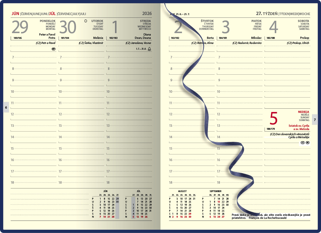 Luxusný manažérsky týždenný diár z ekologickej kože s prehľadným kalendáriom na celý týždeň. Diár je v pevnej väzbe s prednou aj zadnou penovou doskou, doplnený ozdobným prešitím po obvode diára, strieborným plieškom s rokom a dvoma lacetkami. Obsahuje slovenské kalendárium.
