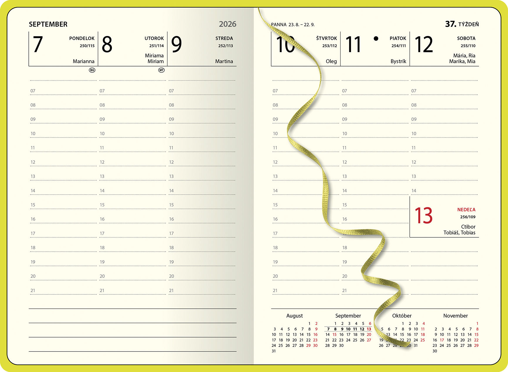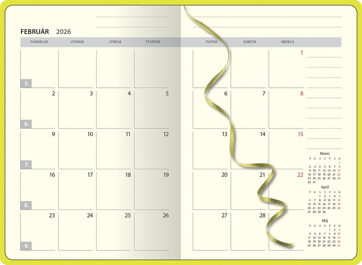 Štýlový týždenný diár v modrej farbe s prehľadným kalendáriom na celý týždeň. Diár má praktickú flexi väzbu. Stredom diára je gumička prichytená o kovový úchyt. Obsahuje slovenské kalendárium.